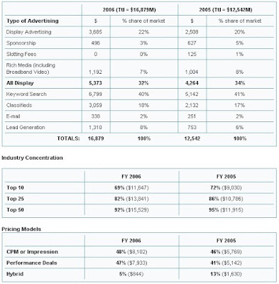 从上图中可以看出,在广告形式方面,2006年和2005年相比,并没有太多变化。而在线广告的产业集中度继续提高,传统行业的在线广告增长相对缓慢。虽然展示计费的和效果计费这两种大的计费方式在在线广告市场中基本上还是各占半壁江山,但是报告数据仍然显示效果计费方式的比例在缓慢的增长。